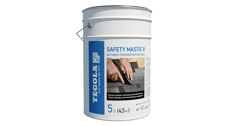 Битумно-полимерная мастика холодного применения для дополнительной фиксации лепестков черепицы и герметизации примыканий, ендов и нахлестов гидроизоляционных мембран (подкладочных ковров). Мастика битумная СЕЙФИТИ МАСТИК представляет однородную клеевую массу, состоящую из битума, бутадиен-стирольного термопласта, наполнителя, растворителя и технологических добавок. Обеспечивает надежное соединение битумной черепицы к различным основаниям: кирпичной кладке, бетону, металлу, дереву и др. По составу мастика СЕЙФИТИ МАСТИК полностью соответствует составу гибкой битумной черепицы и не вызывает деформации.