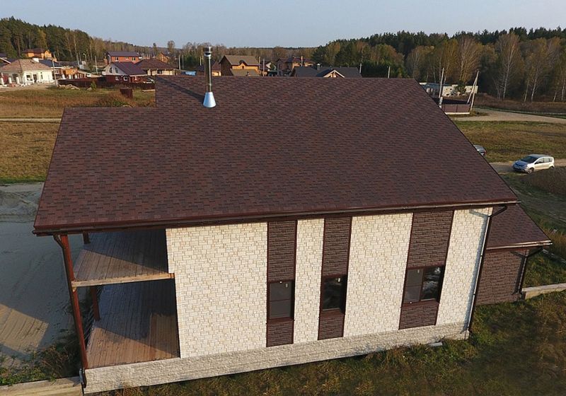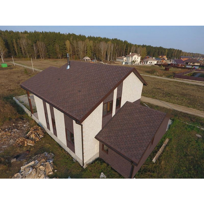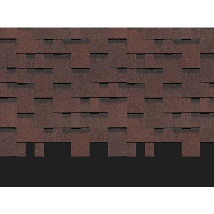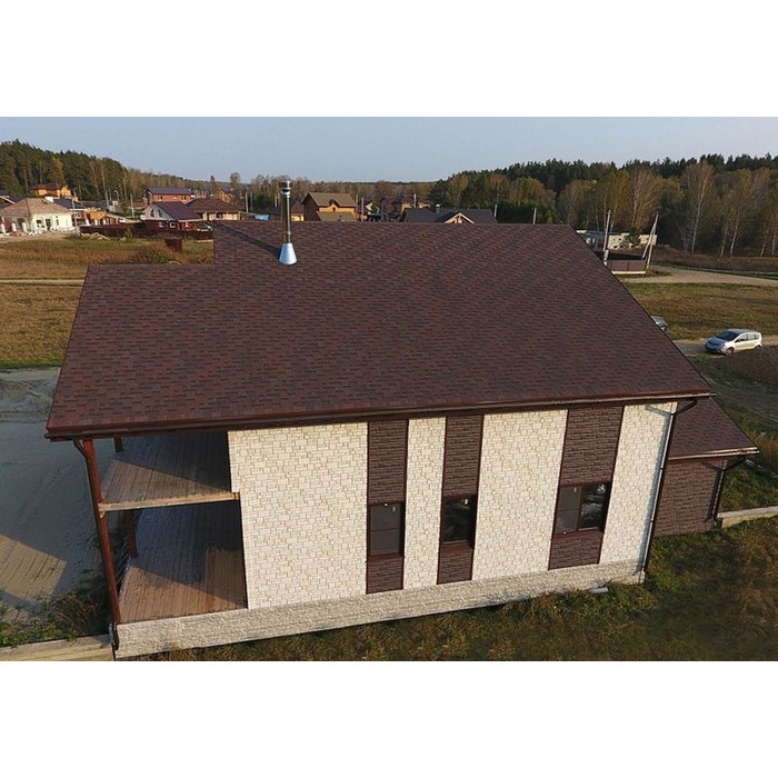 Черепица в глубоких темно-каштановых оттенках отлично подойдет для кровель большой площади и сложной конфигурации. Оригинальность покрытию придает несимметричный перехлест лепестков и выразительный 3D-эффект. Кровля хорошо смотрится с фасадами, выполненными в сливочных, карамельных, фисташковых, терракотовых тонах.