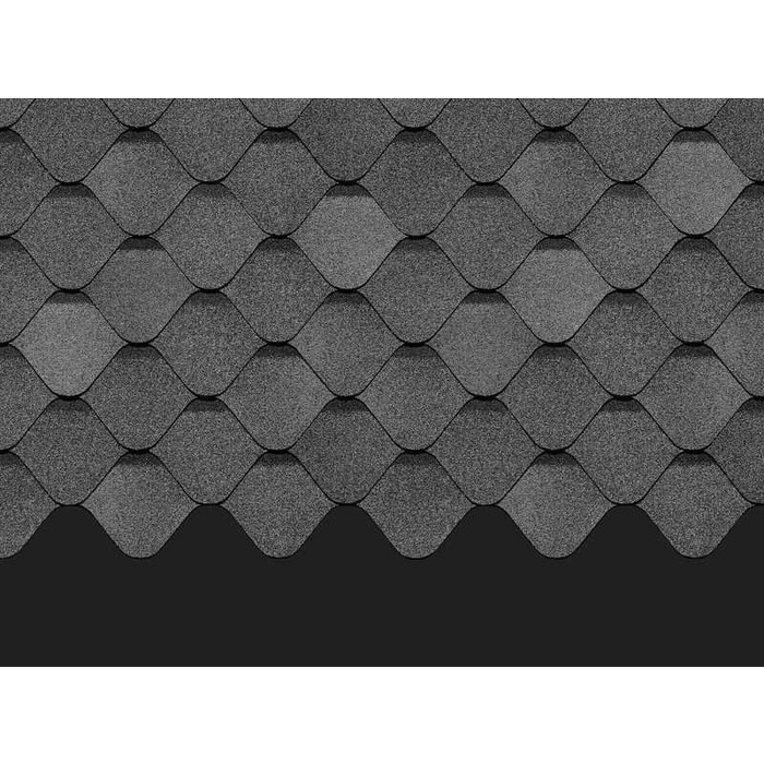 Благородный графитовый цвет подчеркивает эффектную овальную форму лепестков. Гонты создают эффект морской волны, а затемненные участки делают покрытие объемным. Черепица сочетается с нейтральными светлыми и оригинальными яркими фасадами.