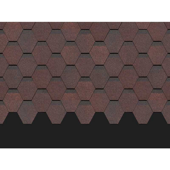 Насыщенные благородные оттенки с мягкими переливами цвета смотрятся благородно и дорого. Гексагональная форма лепестков гонтов и затемненные участки создают эффект объемного покрытия. Черепица отлично смотрится со светлым бежевым сайдингом, фасадными панелями под сланец, песчаник, юрский мрамор.