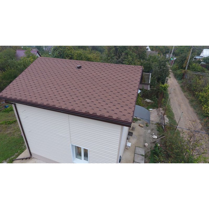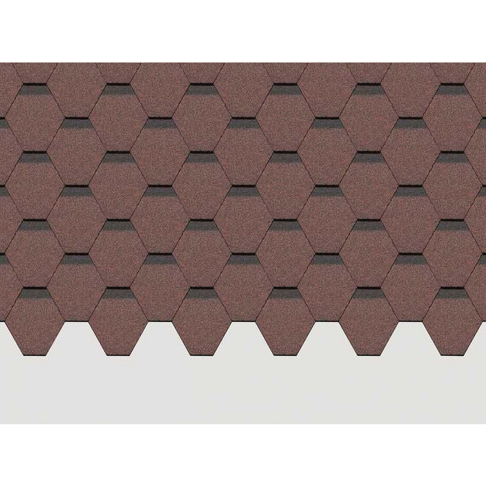 Красная черепица с лепестками гексагональной формы сделает выразительной кровлю простой формы и подчеркнет оригинальность сложных проектов. Она особенно хорошо смотрится с нейтральными бежевыми оттенками и светлыми фасадными панелями под камень.