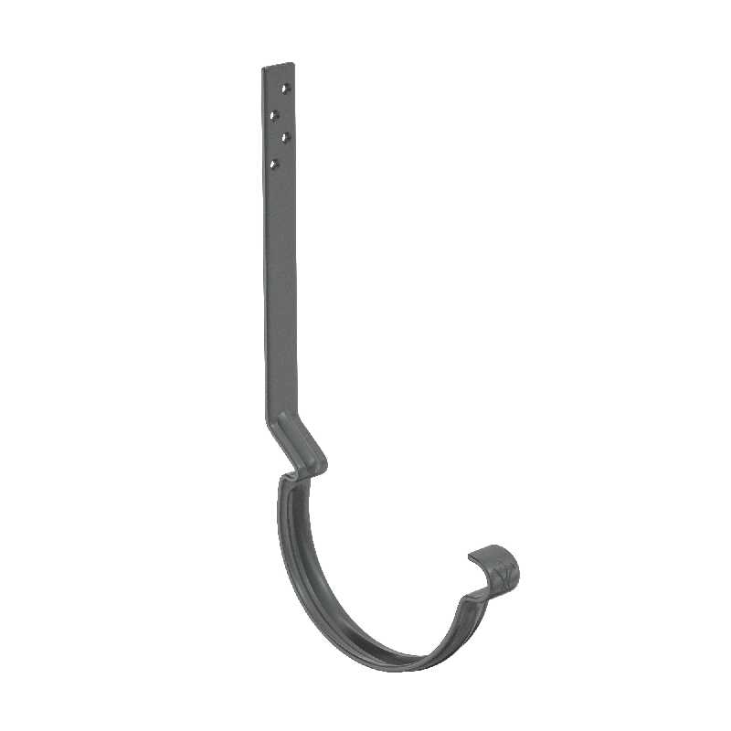 Поставляется с комплектом креплений. Конструкция крюка имеет более вытянутое и глубокое ребро жесткости, поэтому крюк выдерживает повышенные силовые нагрузки. Передний замок крюка фиксирует завиток желоба снаружи, и благодаря этому желоб удобно монтировать даже после установки фартука-капельника. Задний замок имеет конструкцию, исключающую смещение желоба под нагрузкой. Отверстия под крепеж выполнены с зенковкой под шляпку в потай. На передней части крюка расположен фирменный штамп - лилия.