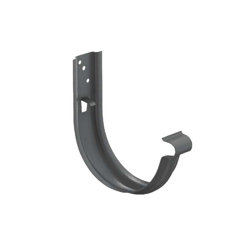 Крюк крепления желоба универсальный предназначен для крепления водосточного желоба по аналогии со стандартными крюками крепления желоба, и может быть использован как в качестве короткого крюка, так и в качестве длинного (при условии применения удлинителя крюка). Наличие изгиба для завитка желоба в передней части позволяет устанавливать желоба в крюки без отгиба установленного ранее фартука («капельника»). Наличие дополнительных ребер жесткости делает крюк очень прочным.