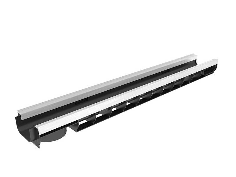 Лоток усилен по боковым кромкам металлической пластиной с выемкой, в которую удобно закладывать решетку, выполненную из пластика, металла или чугуна. Изделие рекомендовано к установке на ровных площадках, не имеющих уклона, или в верхних частях наклонных участков.