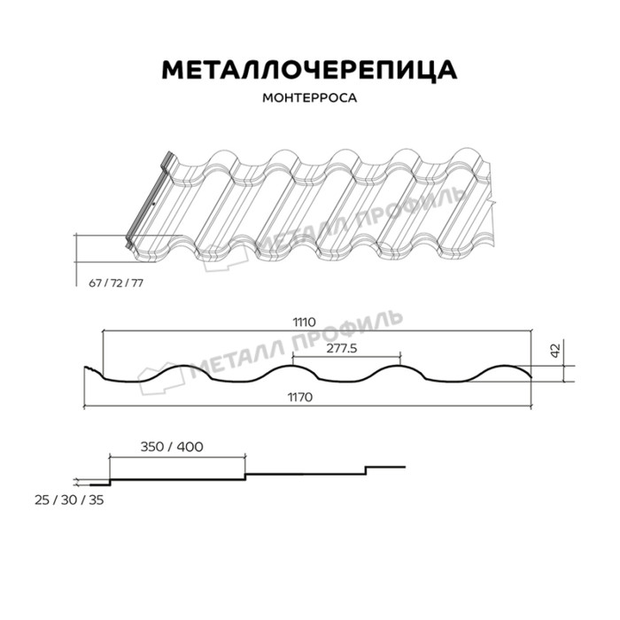 Металлочерепица Монтерроса® производится из качественного сырья. Это значит, что вы, без сомнения, получаете прочную и долговечную крышу из металла. Профиль Монтерроса® гармонично соединяет в себе глубокий рельеф и мягкость очертаний. Несмотря на глубину волны, места соединений металлочерепицы незаметны благодаря технологии 3D-реза. Модифицированные боковые замки обеспечивают герметичность соединений. Чтобы придать дому особую выразительность, при заказе черепицы можно варьировать высоту и длину ступеньки. Профиль Монтерроса® выпускается с различными покрытиями из ассортимента компании «Металл Профиль». Таким образом, ваша кровля приобретает респектабельный внешний вид и долговечность.