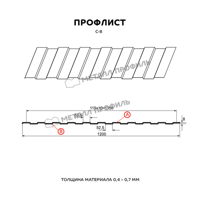 Профиль с самой низкой трапецией в каталоге Компании Металл Профиль. Назначение профиля С-8 – скорее дизайнерская задача, нежели прочностная. Профлист с высотой 8 мм замечательно подходит для таких решений, как: постройка ограждений, не подверженных большим снеговым и ветровым нагрузкам, создание вентилируемых фасадов, внутренняя отделка промышленных строений, системы подвесных потолков. Идентичная с двух сторон форма проката делает С-8 очень удобным исходным материалом для разноплановых дизайнерских замыслов. Оптимальная толщина стали – от 0,4 до 0,7 мм позволяет профлисту отлично справляться с любым своим назначением. А большая полезная ширина (1150 мм) помогает сэкономить на закупке профлистов. По вашему заказу мы можем изготовить листы металлопроката длиной от 0,5 до 12 метров.