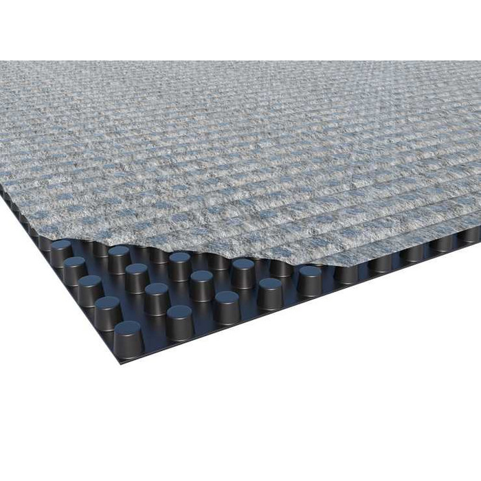 Многофункциональная профилированная ПВП-мембрана с припуском для нахлеста с одной стороны и термически прикрепленным полотном Typar из полипропилена.