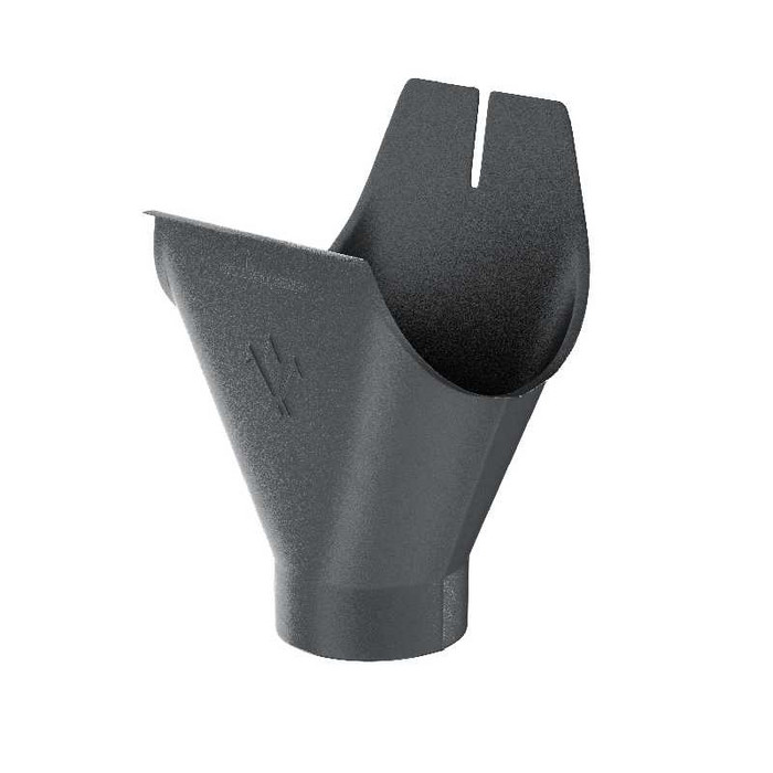 Воронка желоба устанавливается на водосточном желобе и является устройством, передающим поступающую из желоба воду в водосточную трубу. Не требует дополнительных мер по герметизации. Надежность воронки желоба обеспечивается наличием усиленного ребра жесткости в передней части.